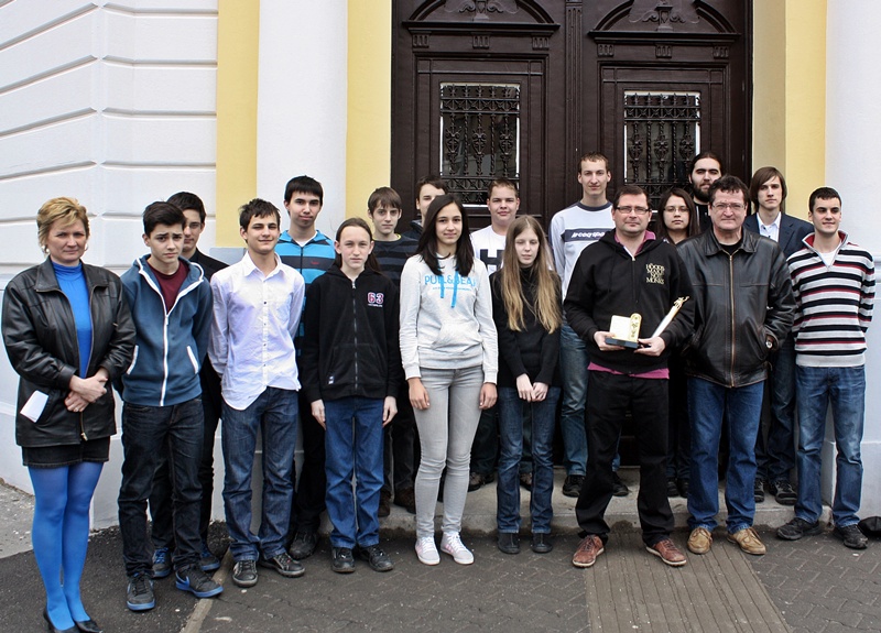 A képen iskolánk versenyzői, a felkészítő tanárok (Kiszely Ildikó, Simon Gyula) és volt diákunk Priskin Gyula Oscar- és Kossuth-díjas programozó látható.